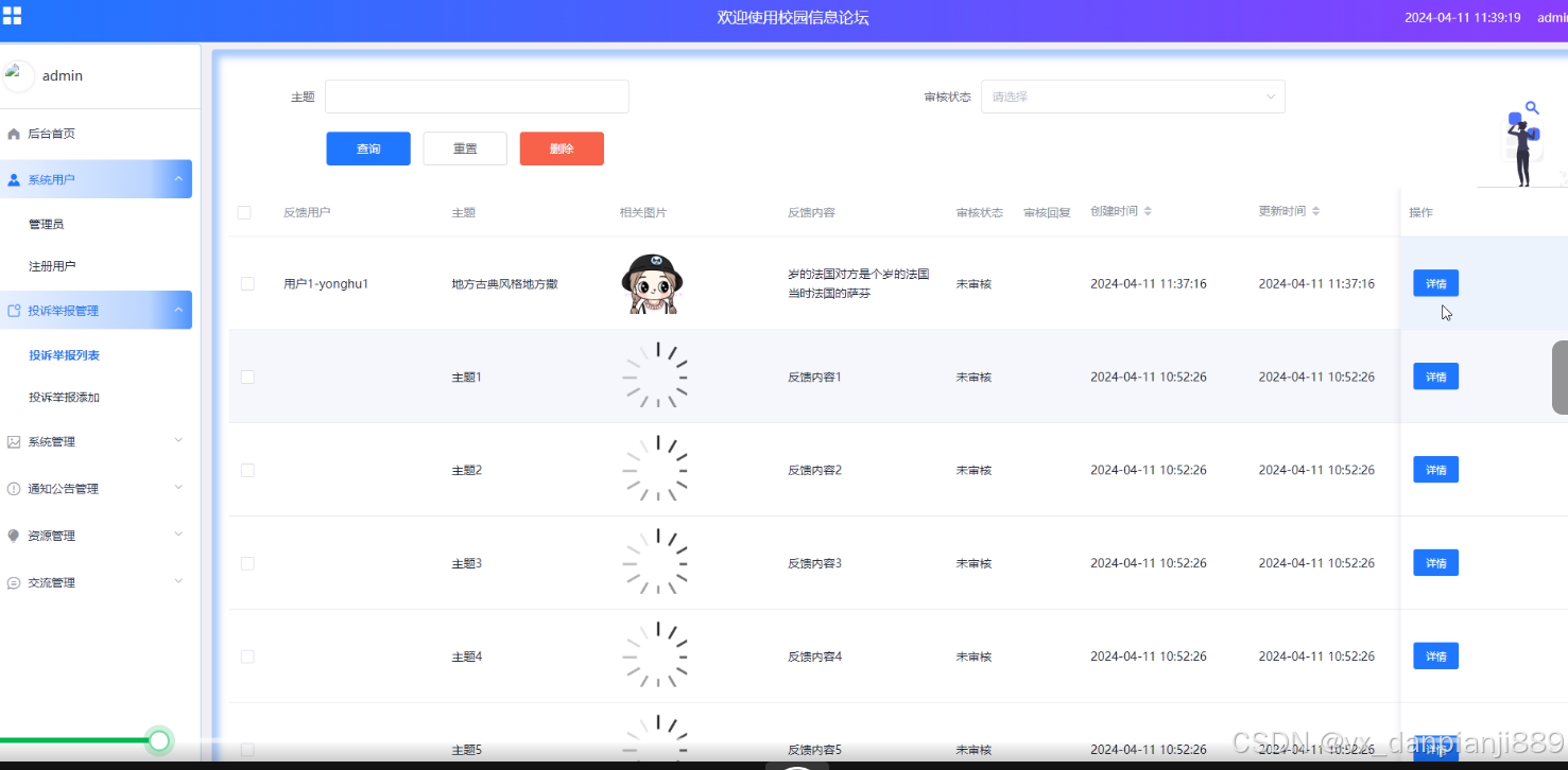 管理员可以管理交流论坛,包括审核帖子、回复用户问题、管理评论等,维护论坛交流的秩序和内容质量。交流管理界面如下图所示。