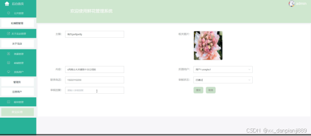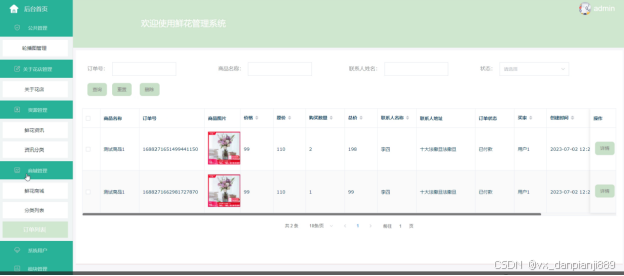 (5)鲜花商城管理:管理员可以对鲜花商城中的鲜花商品信息进行增删改查,对用户提交的订单信息进行处理,对鲜花进行分类。