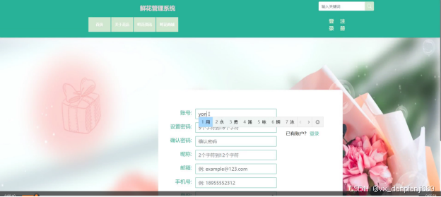 不是鲜花管理系统中正式用户的是可以在线进行注册的,当用户右上角“注册”按钮的时候,当填写上自己的账号+密码+确认密码+昵称+邮箱+手机号等信息后再点击“注册”按钮后将会先验证输入的有没有空数据,再次验证密码和确认密码是否是一样的,最后验证输入的账户名和数据库表中已经注册的账户名是否重复,只有都验证没问题后即可用户注册成功。其用户注册界面展示如下图4-2所示。