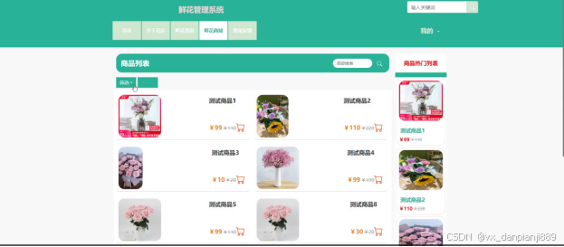 (2)鲜花商城:用户可以查看鲜花商城中的鲜花商品列表,可以查看鲜花名称、原价、描述、库存、分类、花语信息等。