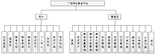按照广西特色美食平台的角色,我划分为了登陆用户模块和管理员管理模块这两大部分。