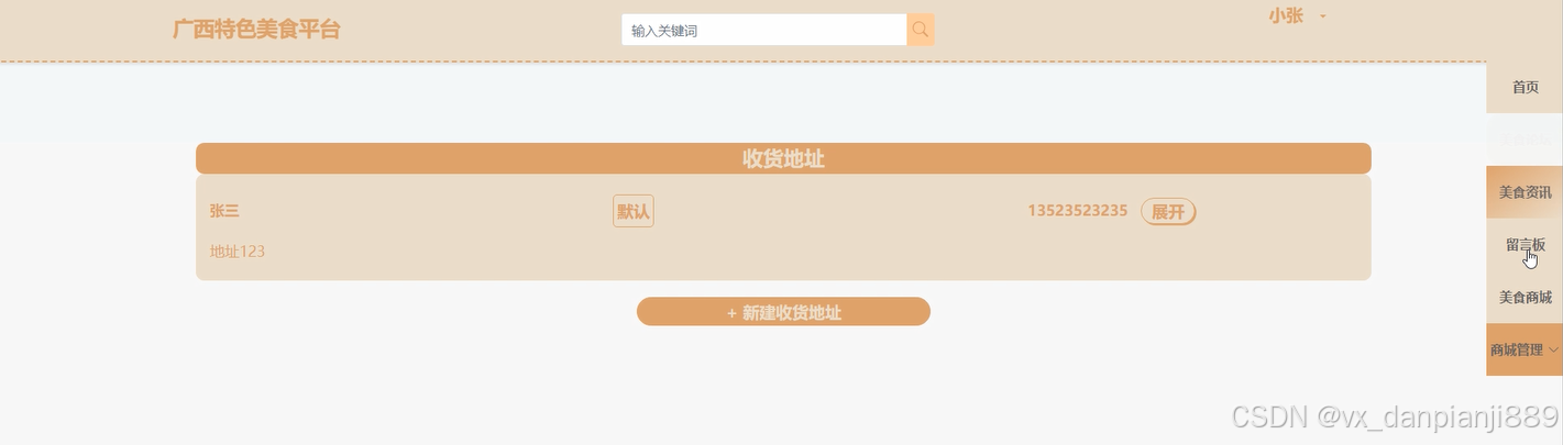 (6)收货地址:点击“美食商城”中“我的地址”按钮的时候就会显示出自己的收货地址信息,支持对收货地址的增删改查操作。
