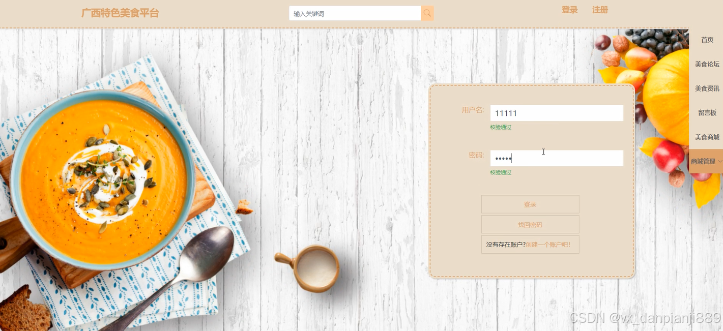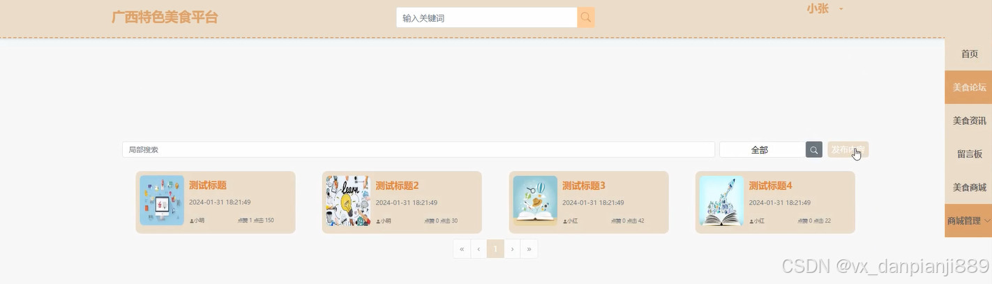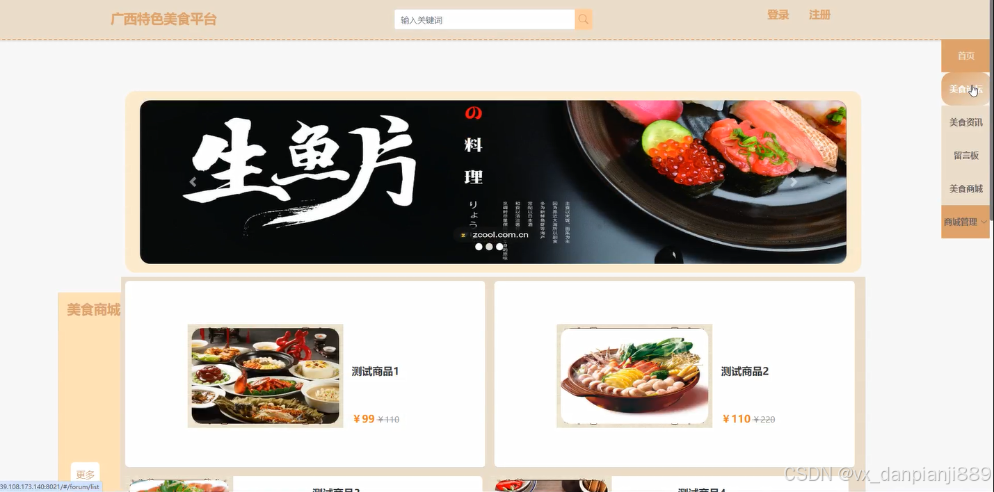 Guangxi Specialty Food Platform is an online food sharing and recommendation platform developed based on the Spring Boot framework. This platform aims to provide a convenient and comprehensive way for users to understand and share the unique culinary culture of Guangxi region. On this platform, users can browse and search for specialty foods from various regions in Guangxi, learn about their preparation methods, raw materials, and cultural stories behind them. At the same time, users can also interact and communicate with other users by posting food reviews and sharing their cooking experiences. In order to improve user experience and recommendation accuracy, the platform adopts data analysis and advanced technology. By analyzing the browsing and liking behavior of users, the system can recommend food that better suits their taste preferences based on personal preferences and taste preferences. In addition, the platform also provides user comments, ratings, and sharing functions, facilitating communication and sharing among users.
