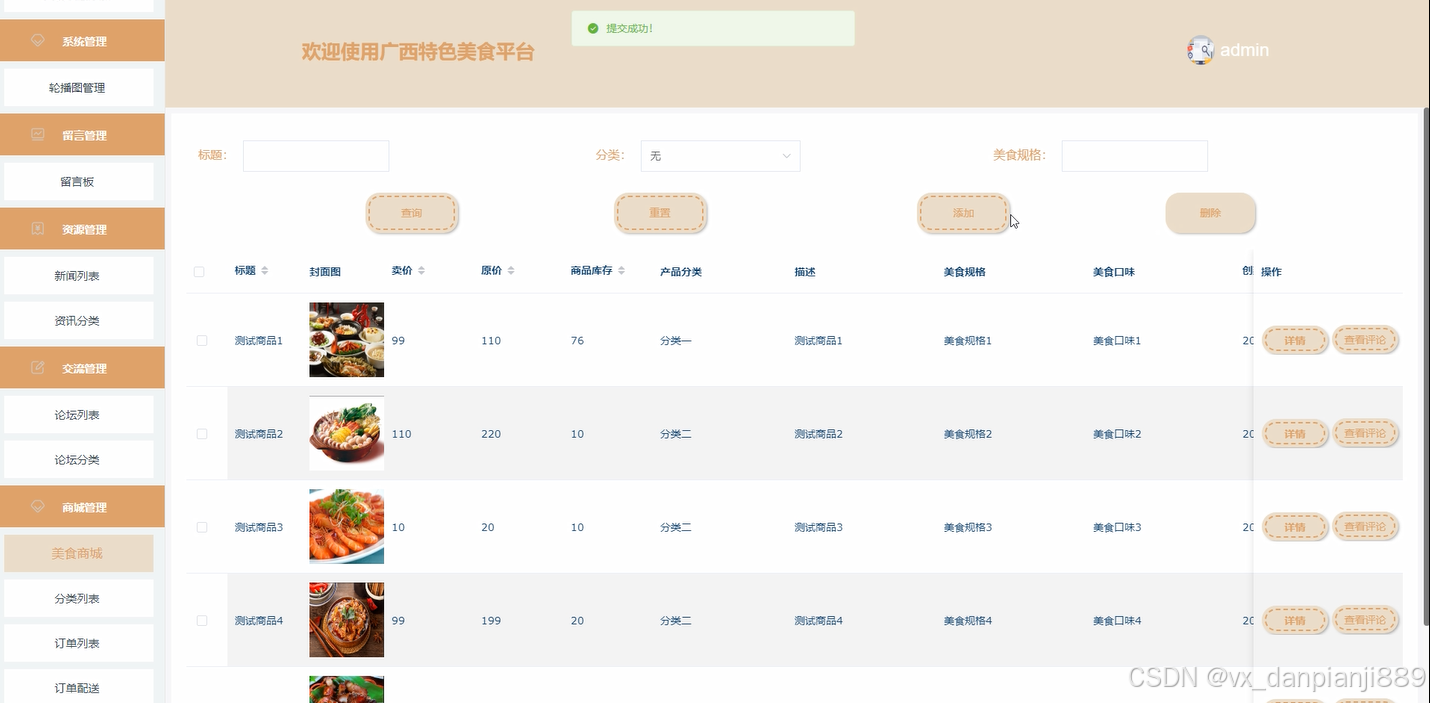 广西特色美食平台中的管理人员是可以对广西特色美食平台内的商家发布的商品进行维护和管理的,支持增删改查操作。商城管理界面如下图4-11所示。