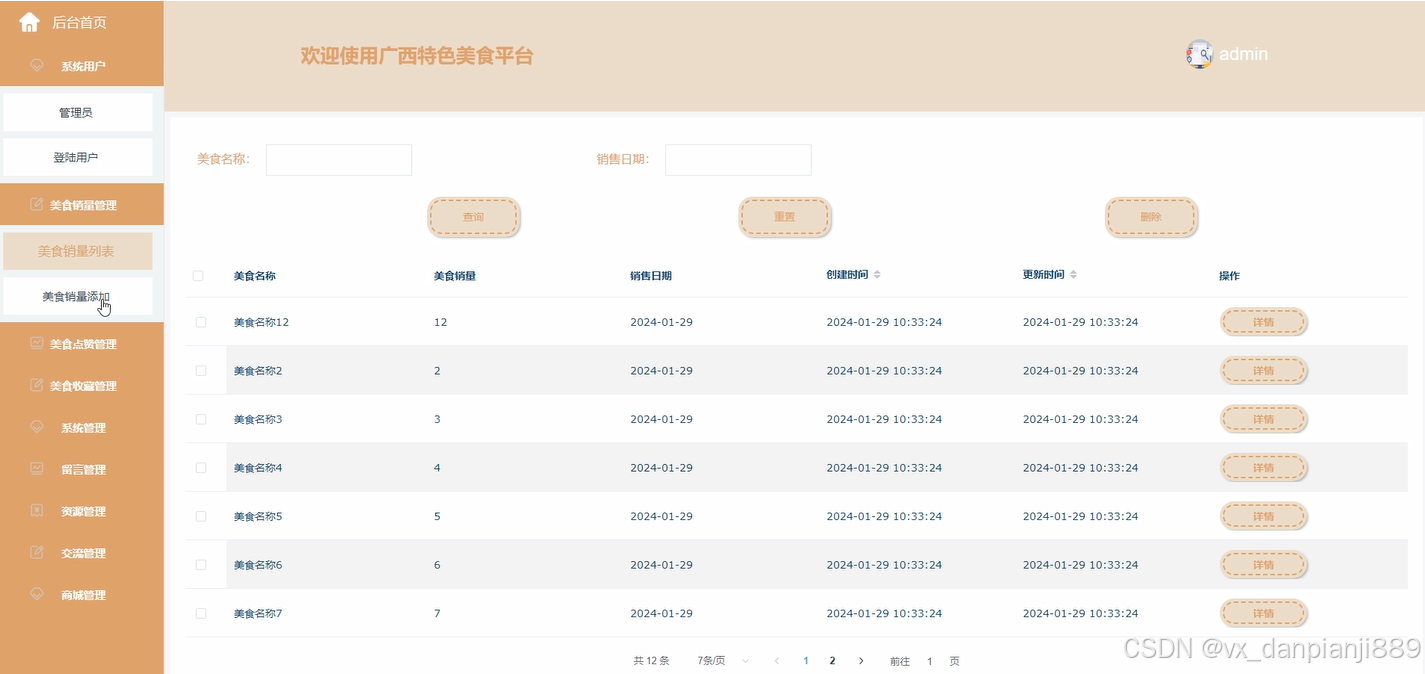 (7)美食销量:管理员点击“美食销量”这一菜单会所有的美食销量,管理员可以对美食销量进行增删改查操作。