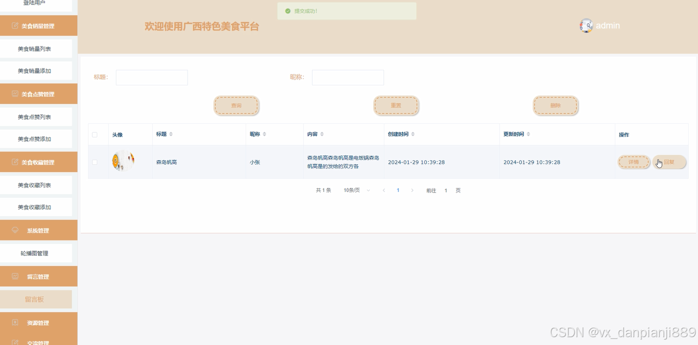广西特色美食平台中的管理人员是可以对前台用户发布的留言进行管控的,界面如下图4-10所示。