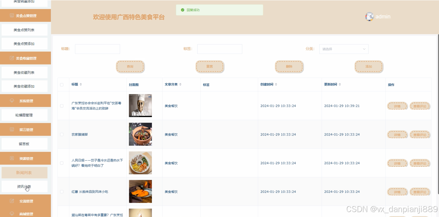 资源容管理主要管理员是对美食资讯以及美食资讯所属的分类进行管控,包含了用户对美食资讯提交的评论信息。界面如下图4-12所示。