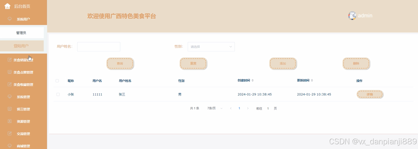 广西特色美食平台中的管理人员是可以对前台注册的用户进行管理的,也可以对管理员进行管控。界面如下图4-8所示。