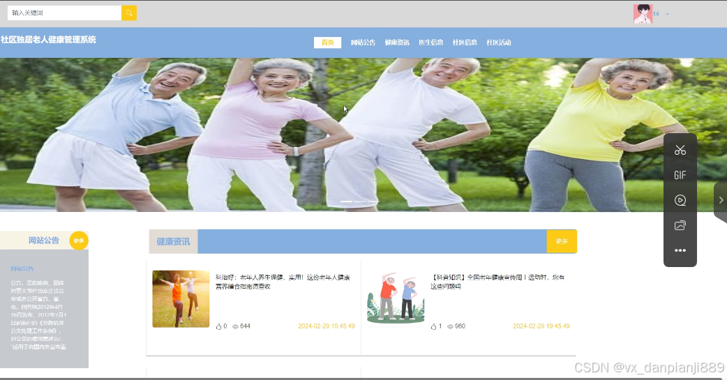 With the advancement of technology, information technology has profoundly influenced various fields of society. The popularization of computers has become an indispensable part, providing us with unlimited possibilities. The community elderly living alone health management system provides multiple functions, including viewing the homepage, personal center, website announcements, health information, doctor information, community information, community activities, etc., providing you with comprehensive community elderly living alone health management services. Administrators are responsible for securely and efficiently storing, managing, and maintaining the system, while also having complete control over backend operations to ensure the normal operation of the system. By introducing MySQL, we can effectively integrate the web and database, thereby better completing all tasks of the community elderly health management system. In this way, both the login authentication of management personnel and the relevant information obtained from the network can be effectively saved through the storage and processing of MySQL. Our design focuses on details and ensures the efficiency, flexibility, and adaptability of the system to various environments. It is easy to understand, easy to use, and has high fluency and clarity. Through our research, our product not only enhances users' understanding of the health management of elderly people living alone in the community, but also makes the flow of information in this field smoother. In addition, our product also has a good user experience, simple and easy to use.