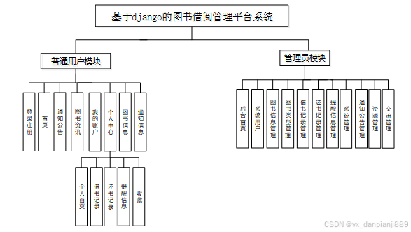 按照基于django的图书借阅管理平台的角色,系统划分为了普通用户模块和管理员模块这两大部分。