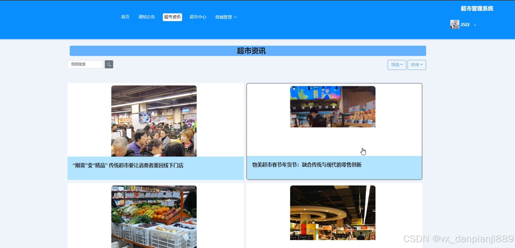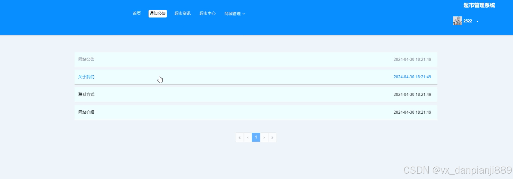 首页:用户登录后的系统入口页面,展示最新的通知公告和超市资讯。