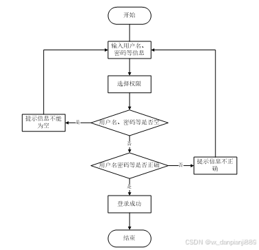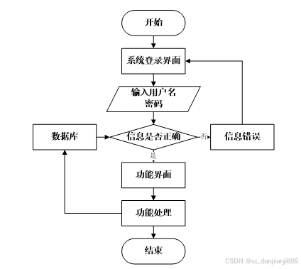 用户打开并进入系统后,会先显示登录界面,输入正确的用户名和密码,系统自动检测信息,若信息无误,则用户会进入系统功能界面,进行操作,否则会提示错误无法登录,操作流程如图2-3所示。