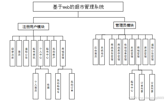 按照基于web的超市管理系统的角色,我划分为了注册用户模块和管理员模块这两大部分。