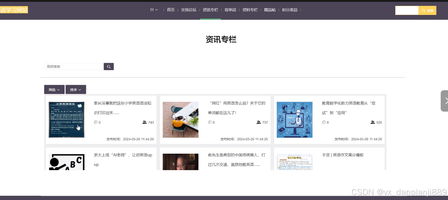 资讯管理是网站发布英语学习相关资讯的模块,它需要支持资讯的发布、编辑、删除等操作,同时需要有良好的分类和标签系统,方便用户查找和浏览。