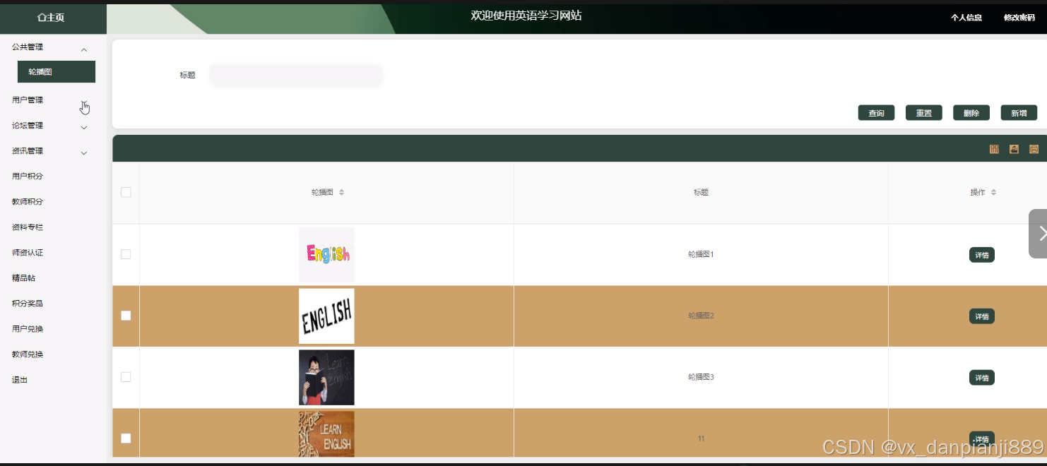 管理员可以对系统前台展示的轮播图进行增删改查,方便用户进行查看。界面如下图4-8所示。