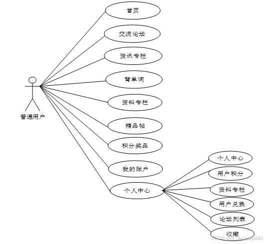 系统的用例展示的是系统功能与用户之间的关系,通过用例的方式能够直观的展示出来,本英语学习网站的完整UML用例图分别是图2-1、图2-2和图2-3。