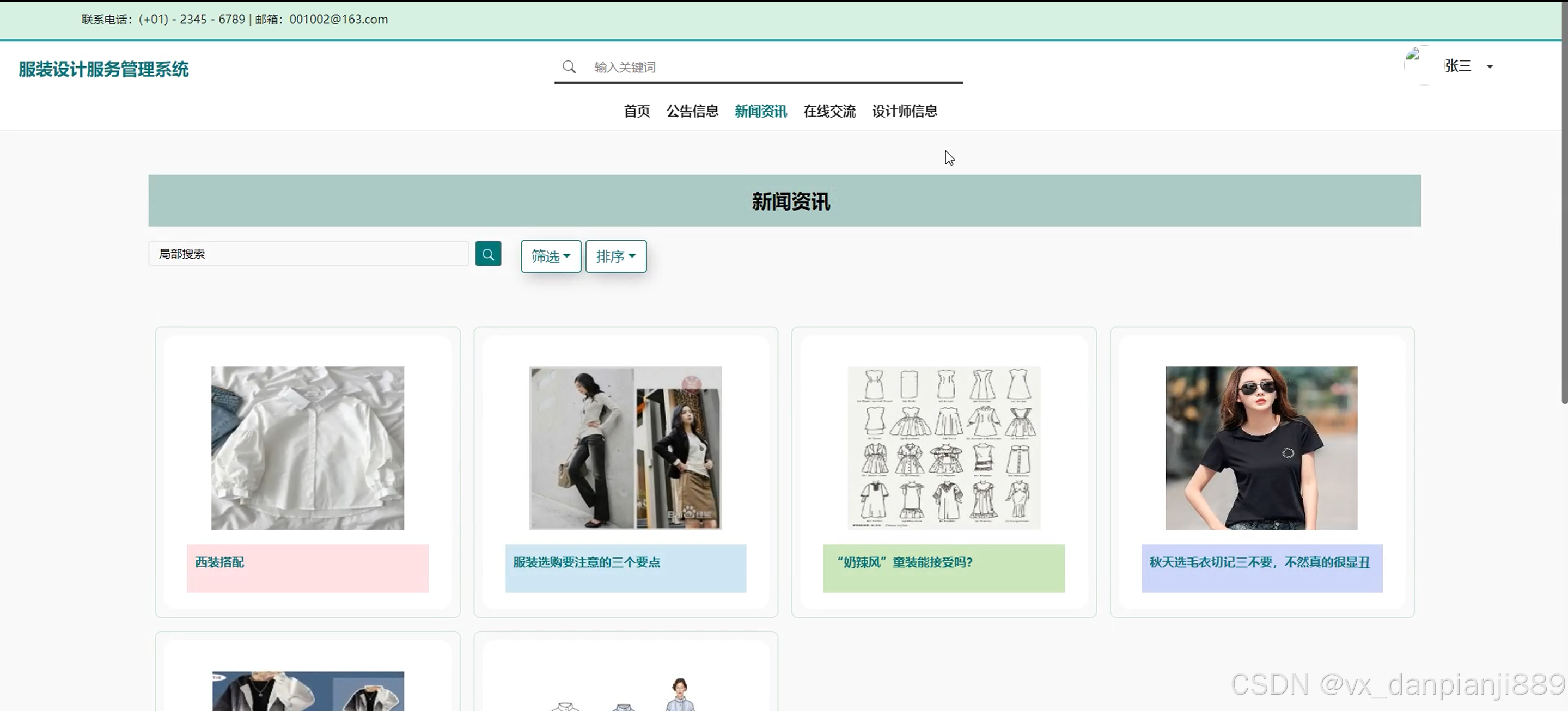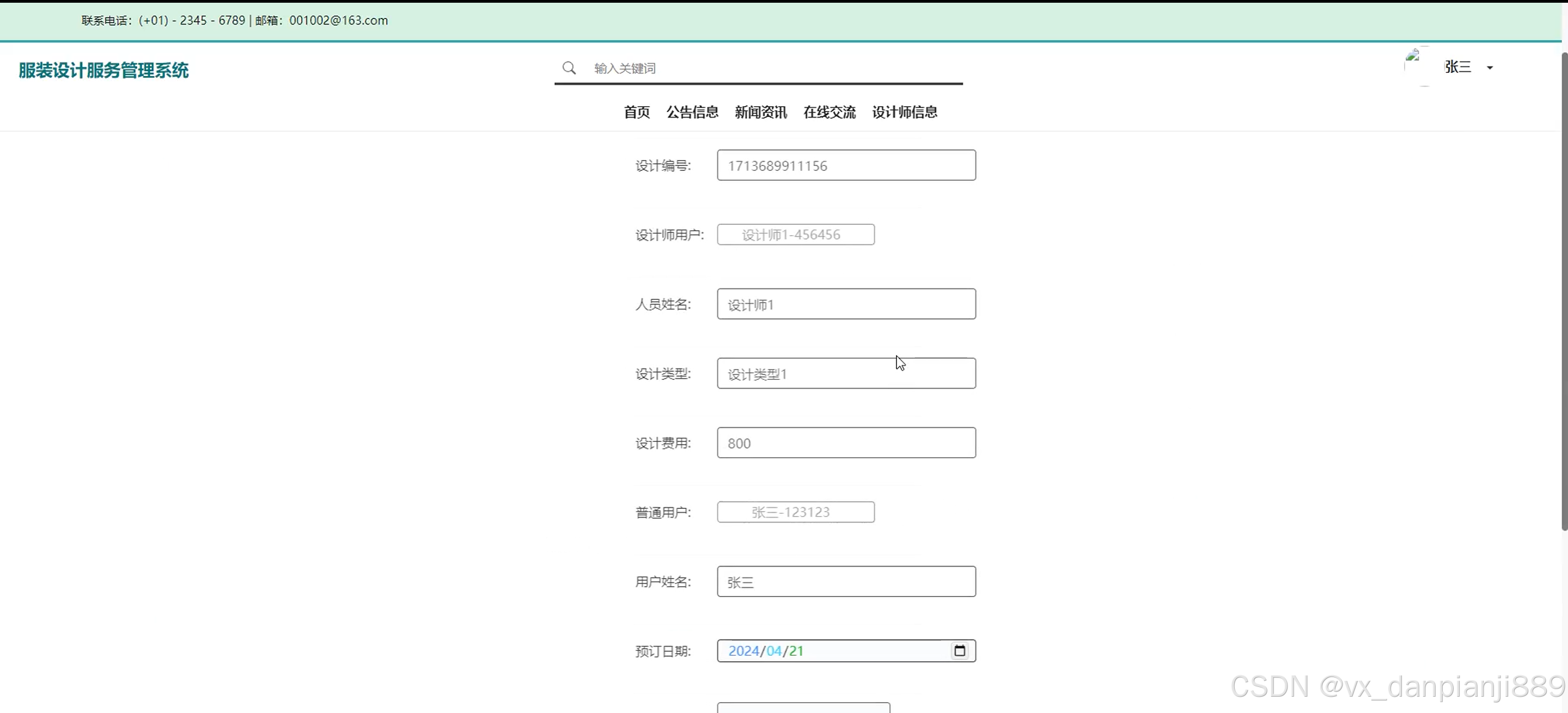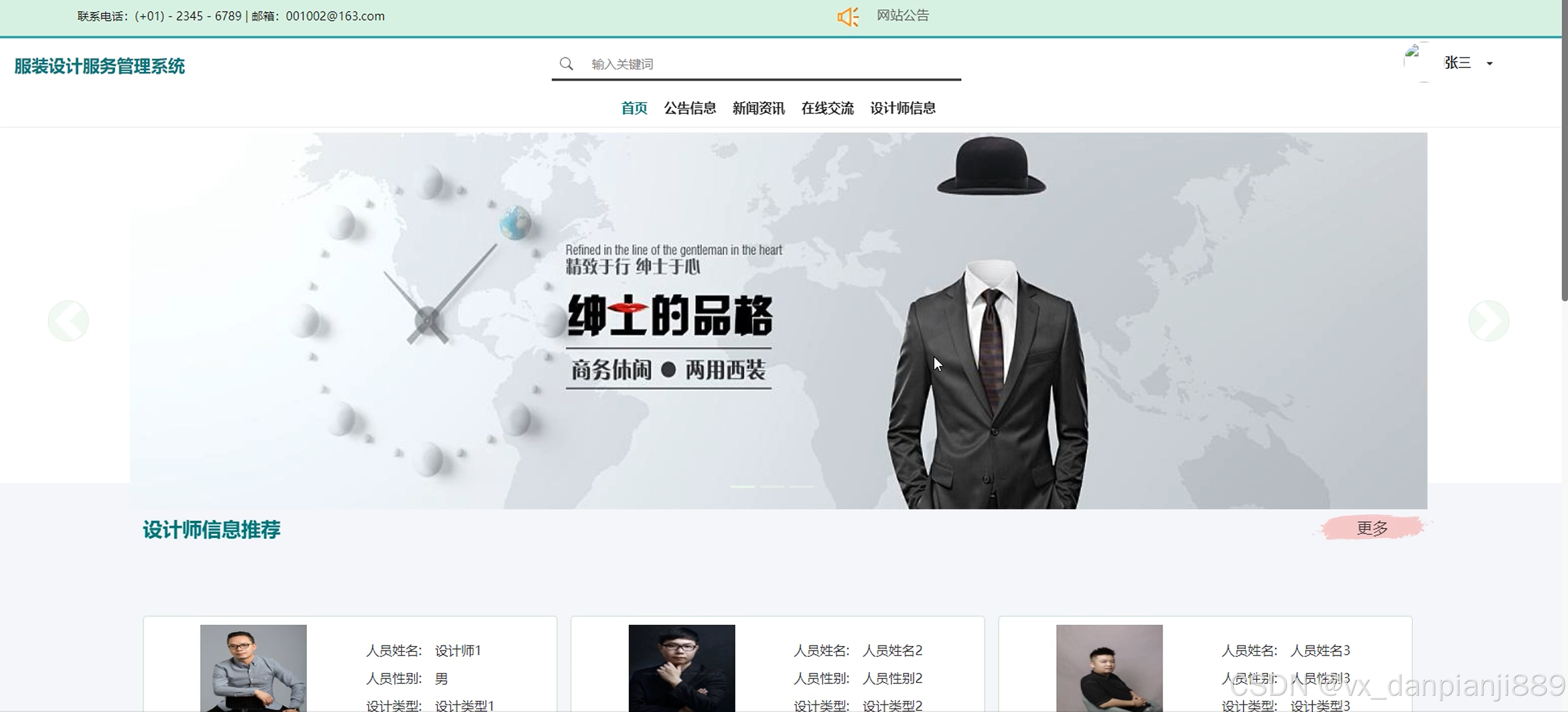 (2)查看服装设计服务管理系统的首页信息:服装设计服务管理系统的首页信息包含了首页、公告信息、新闻资讯、在线交流、设计师信息等。