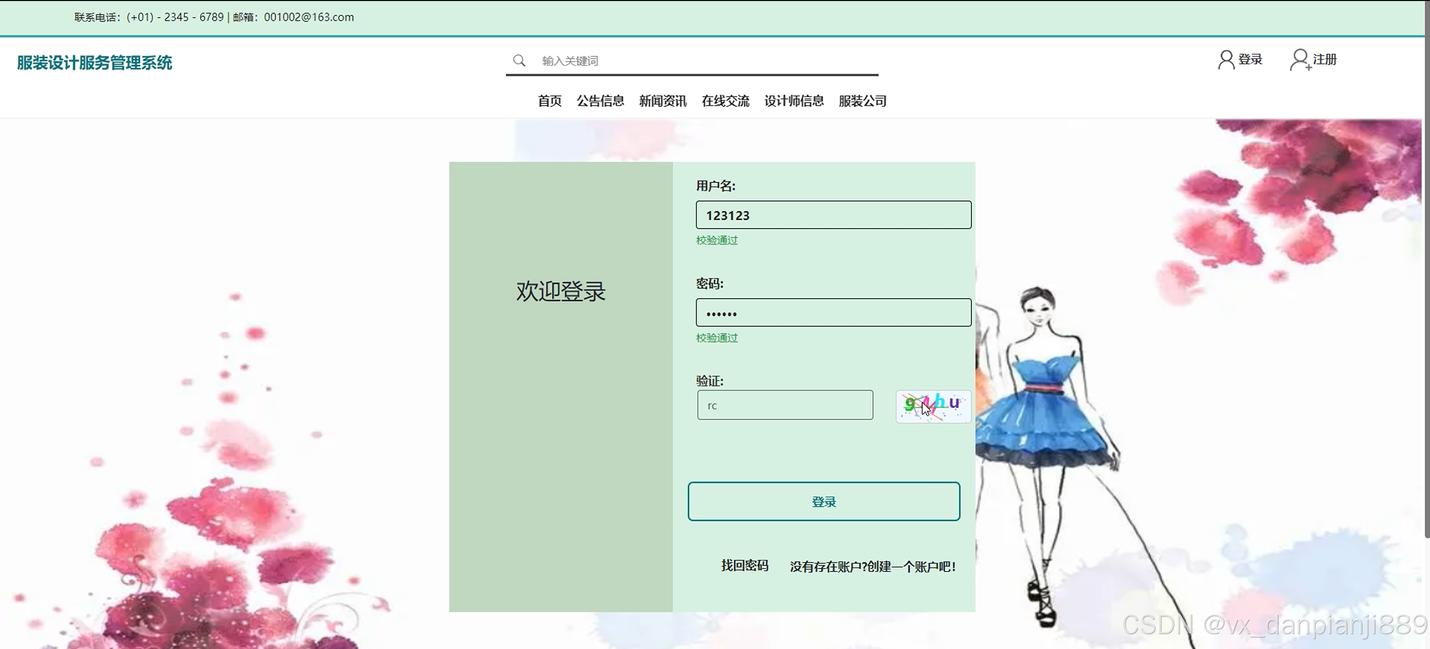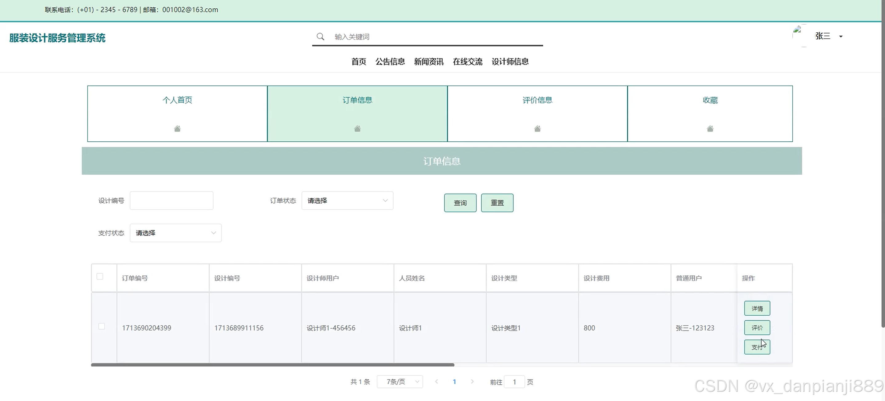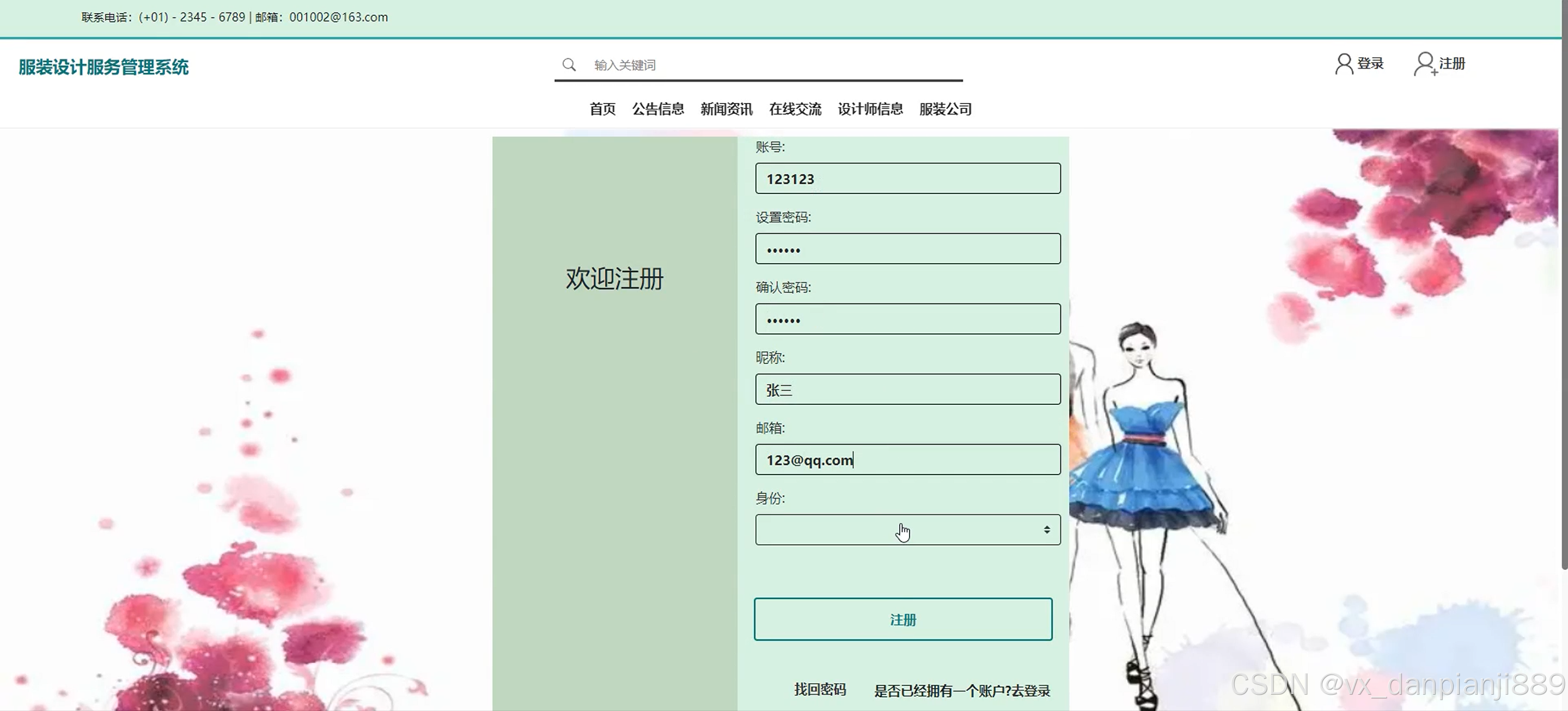 (2)查看服装设计服务管理系统的首页信息:服装设计服务管理系统的首页信息包含了首页、公告信息、新闻资讯、在线交流、设计师信息等。
