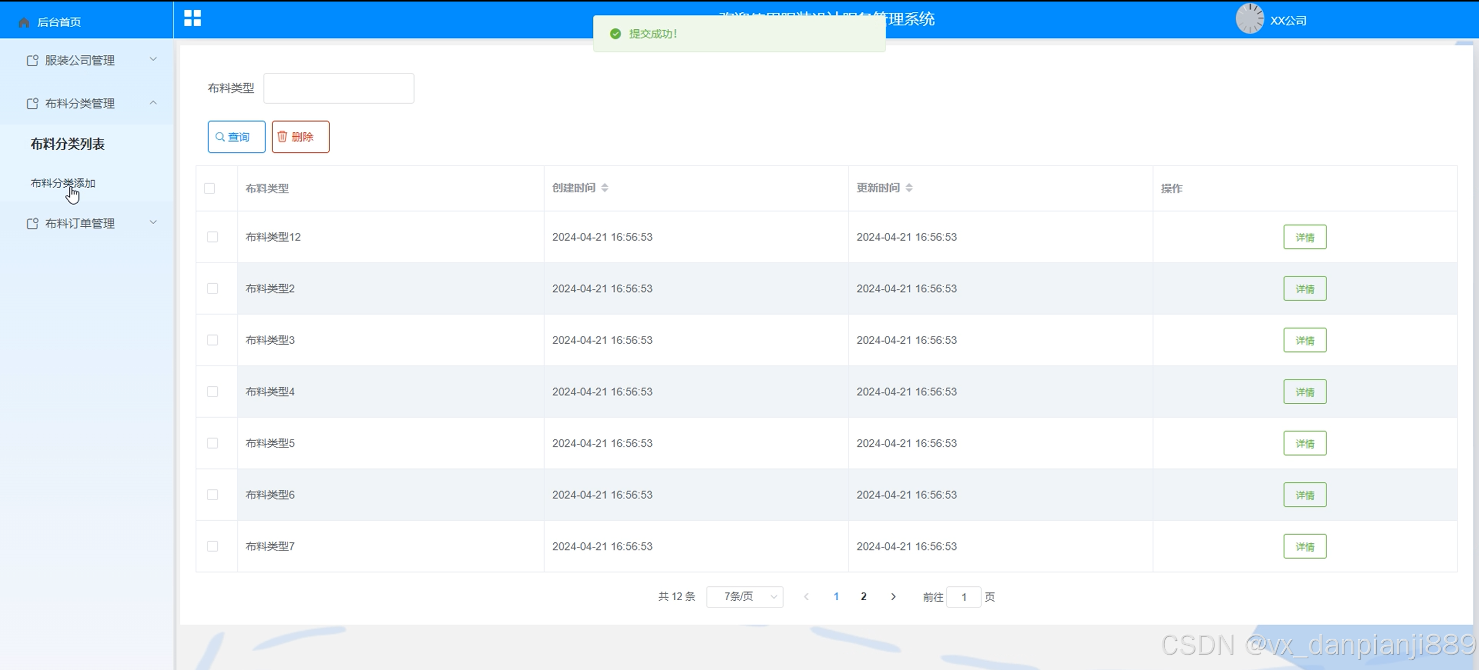 供货用户可以查看布料分类管理详情,让供货用户可以根据材质(如棉、丝绸、合成纤维)、用途(如春夏、秋冬系列)、图案风格等维度对布料进行细致分类,便于买家快速查找所需商品,提升选购效率。布料分类管理界面如下图4-15所示。