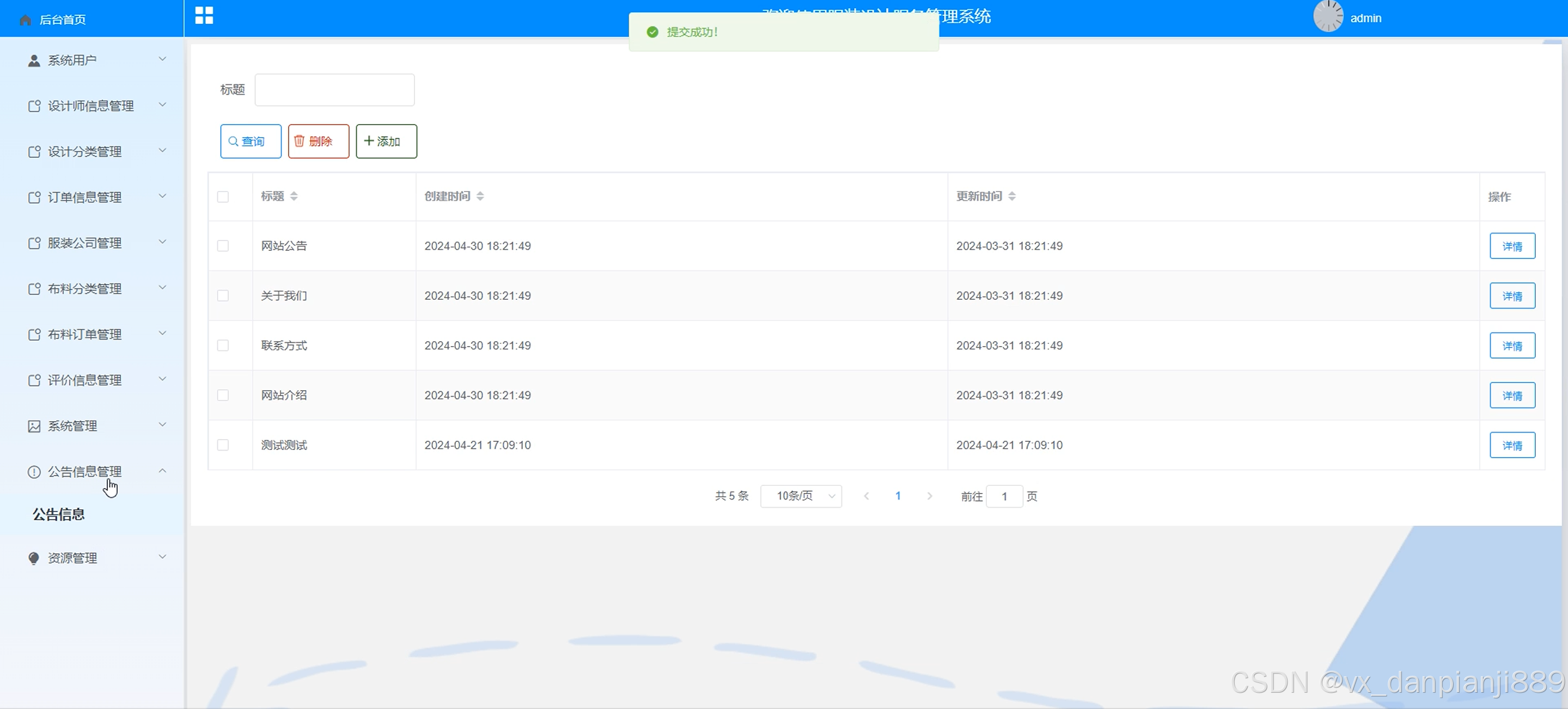 (2)公告信息管理:管理员点击“公告信息管理”菜单可以对首页展示的公告信息进行管理。