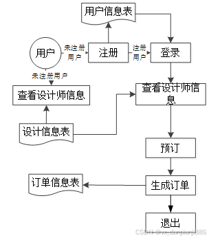 (1)用户注册登录:游客可以随时进入到系统中,对系统中的信息浏览,但是想要实现服装设计服务管理系统预订商品等操作,就必须有这个系统的账号,如果没有账号的话,可以注册用户进行相关的操作,同时用户还可以通过“我的”这个按钮对个人信息以及操作的信息进行管控。