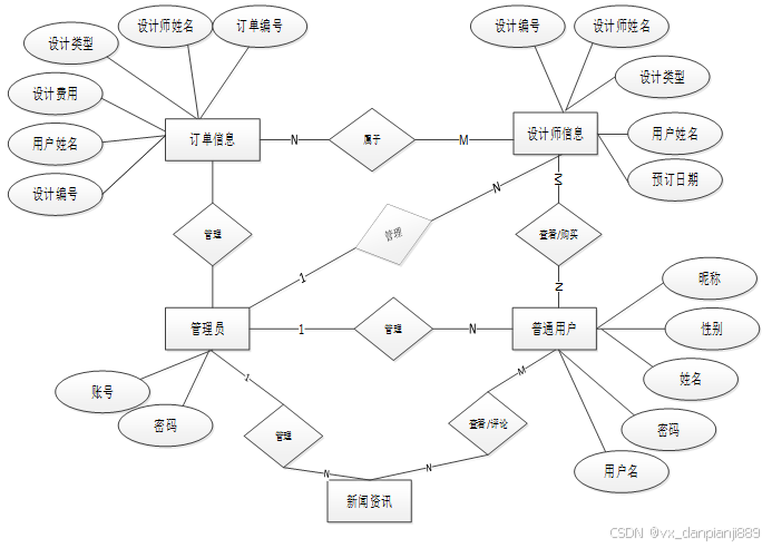 在数据库概念模型设计的时候,一般都采用E-R实体图进行展示,在实体图中可以展示出数据库表中的所有字段名称。下面是整个服装设计服务管理系统中主要的数据库表总E-R实体关系图。