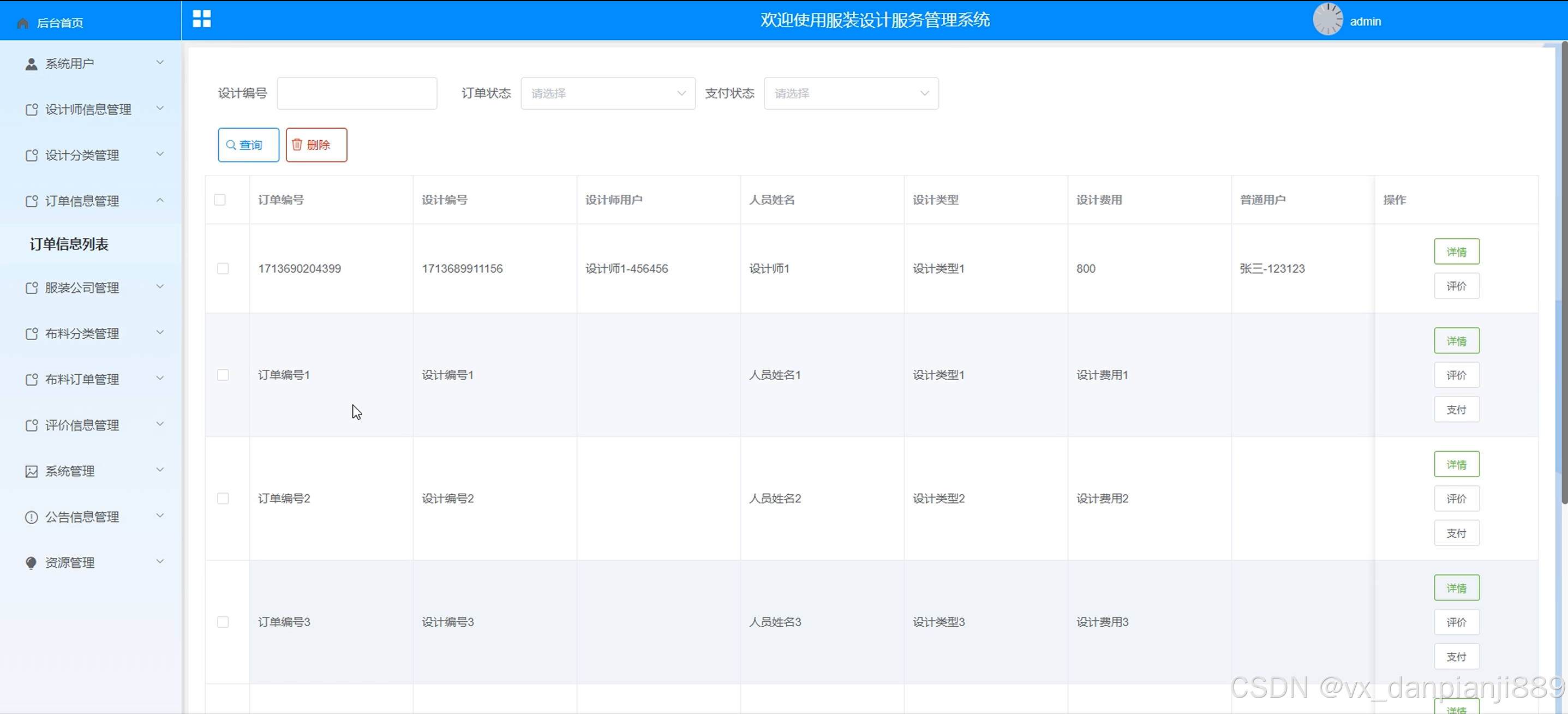 This article proposes a clothing design service management system based on the Spring Boot framework, aiming to optimize the clothing design and production management process by integrating modern information technology, and improve the overall efficiency and innovation ability of the industry. The system designs functional modules around the three core user groups of designers, users, and suppliers, including but not limited to: designer work display and order management, user personalized customization and online communication, as well as supplier fabric classification and order processing, achieving a full chain digital management from design inspiration stimulation, material procurement to finished product customization.