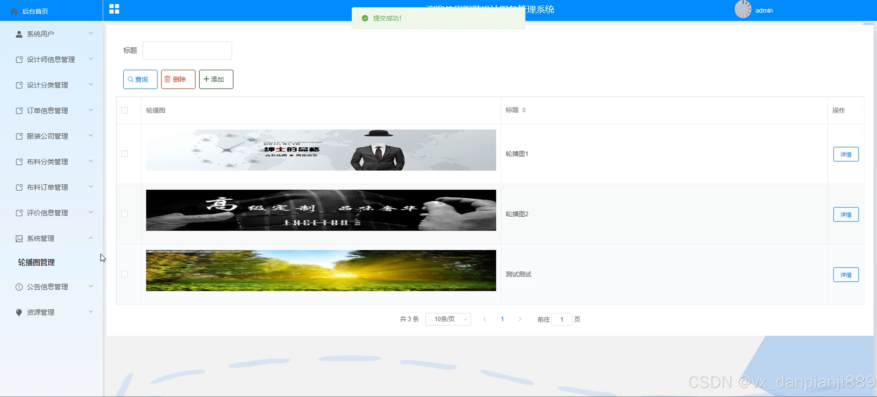 服装设计服务管理系统中的管理人员在“系统管理”这一菜单下是可以对服装设计服务管理系统内展示的轮播图进行添加修改的。轮播图管理界面如下图4-10所示。
