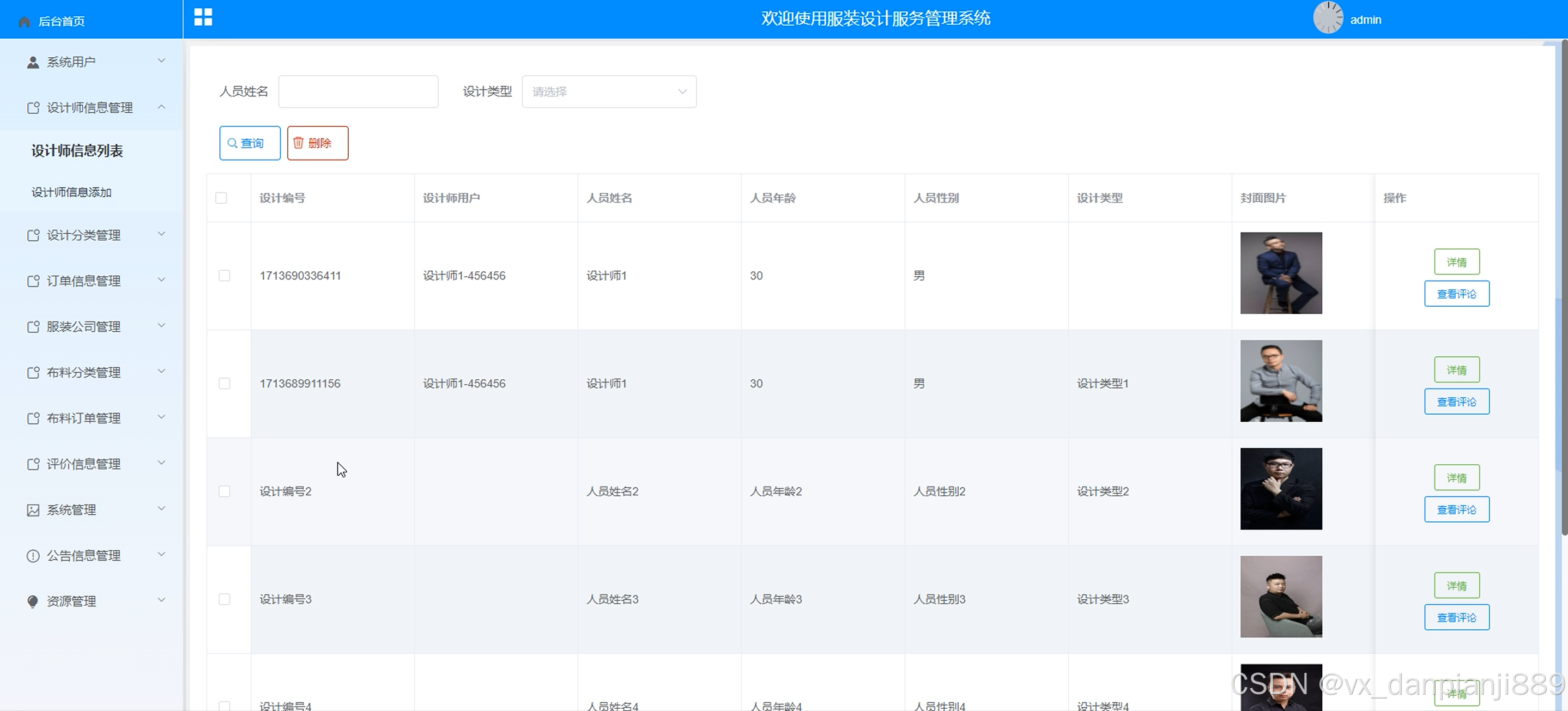 管理员拥有对设计师信息进行添加、修改、删除、管理评论的功能,设计师信息管理界面如下图4-13所示。
