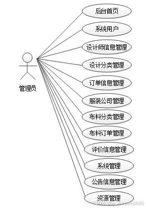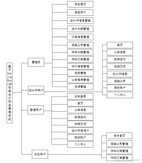 服装设计服务管理系统我划分为了普通用户模块、设计师用户、供货用户和管理员模块这五大部分。