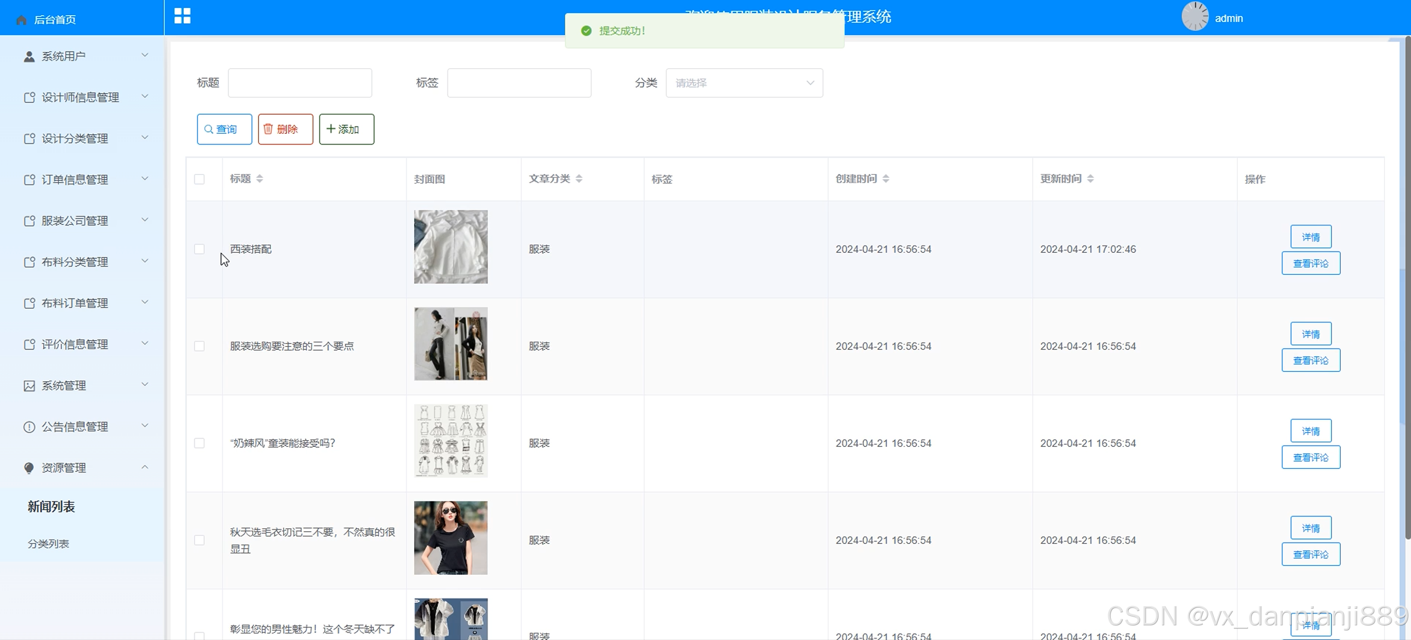 (4)资源管理:管理员可以对服装设计服务管理系统前台展示的新闻列表以及新闻资讯所属的分类进行管控。