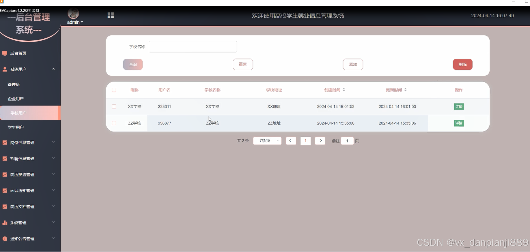 简历投递: 学校用户可以管理学生的简历投递情况,帮助学生与企业进行沟通。