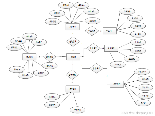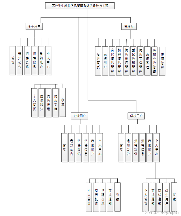 高校学生就业信息管理系统分为四大部分:管理员模块、学生用户模块、企业用户模块、学校用户模块。