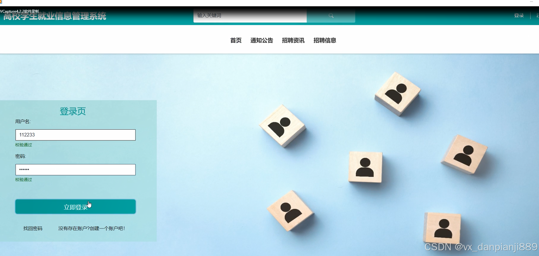 首页:展示最新的通知公告、招聘资讯等信息,让学生及时了解校内外的就业信息和招聘动态。