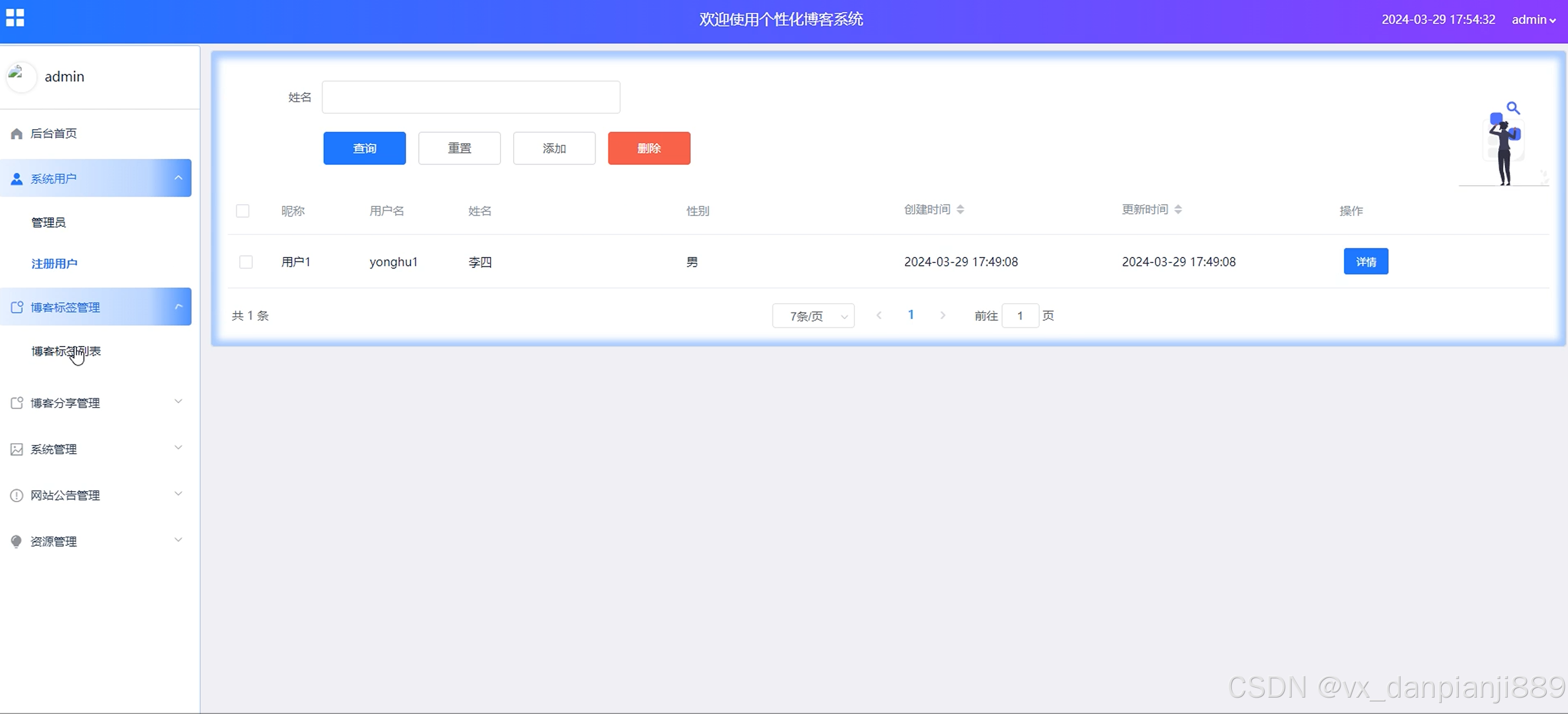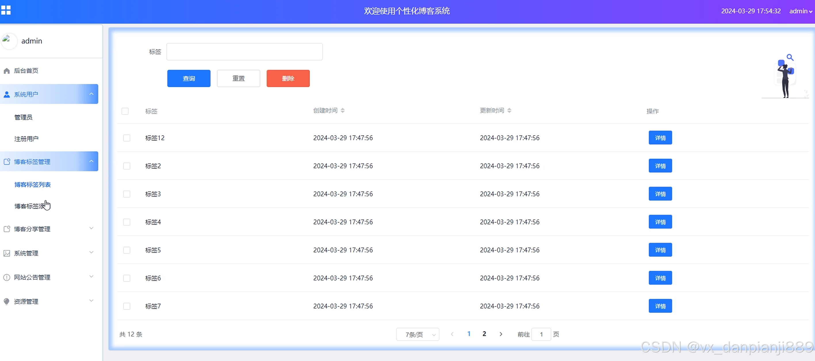 管理员点击“博客标签”,可以对博客标签信息进行增删改查的操作,界面如下图4-7所示。
