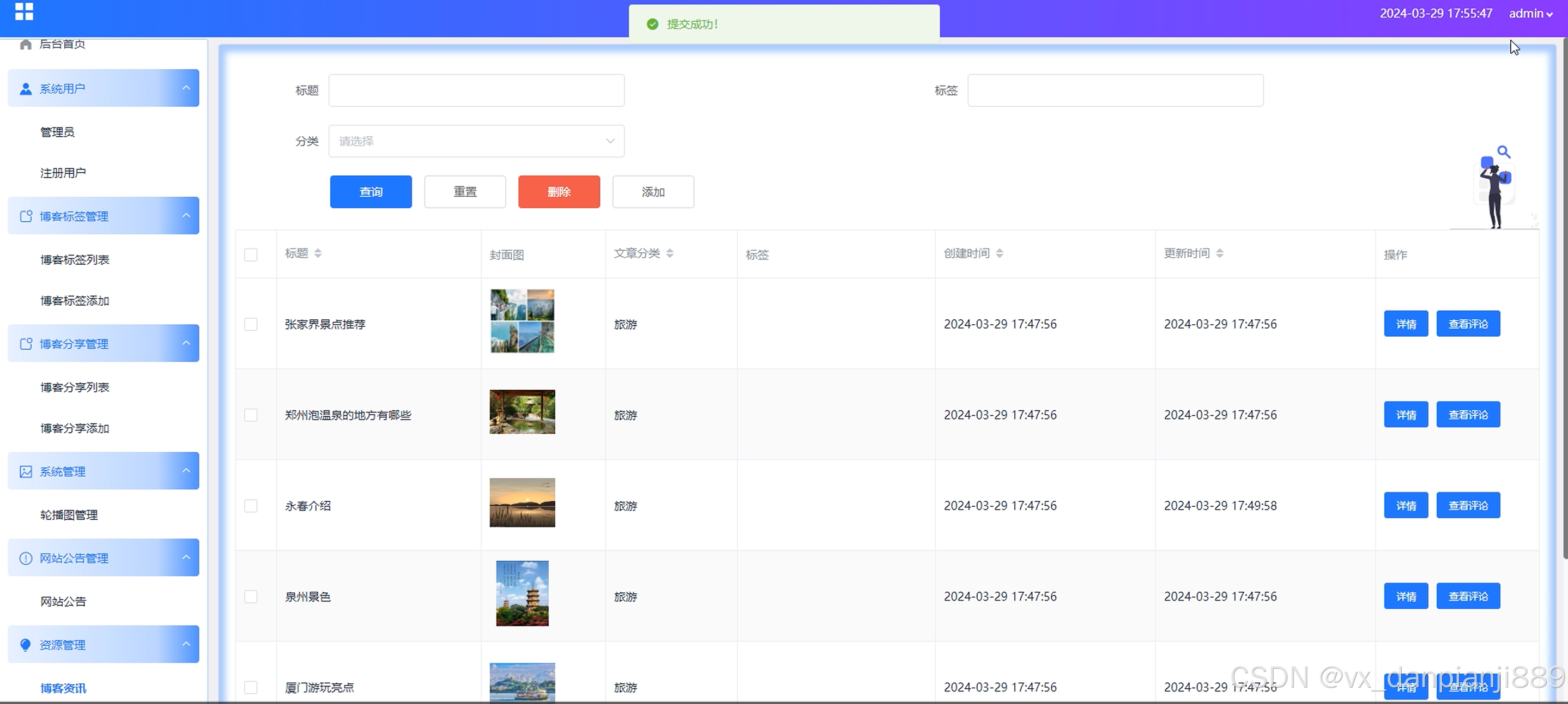 (4)资源管理:进入后台首页工具栏点击“资源管理”这个按钮可以查看所有博客资讯、博客分类列表等信息,可以进行详情查看、删除、查看评论等操作。