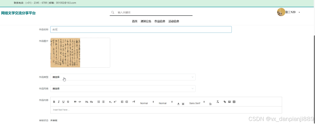 作品信息管理:系统允许作者上传和管理自己的作品信息。作者可以输入作品的作品标题、名称、类型、内容、风格简介等,并上传作品文件或图片。如图4-4所示。