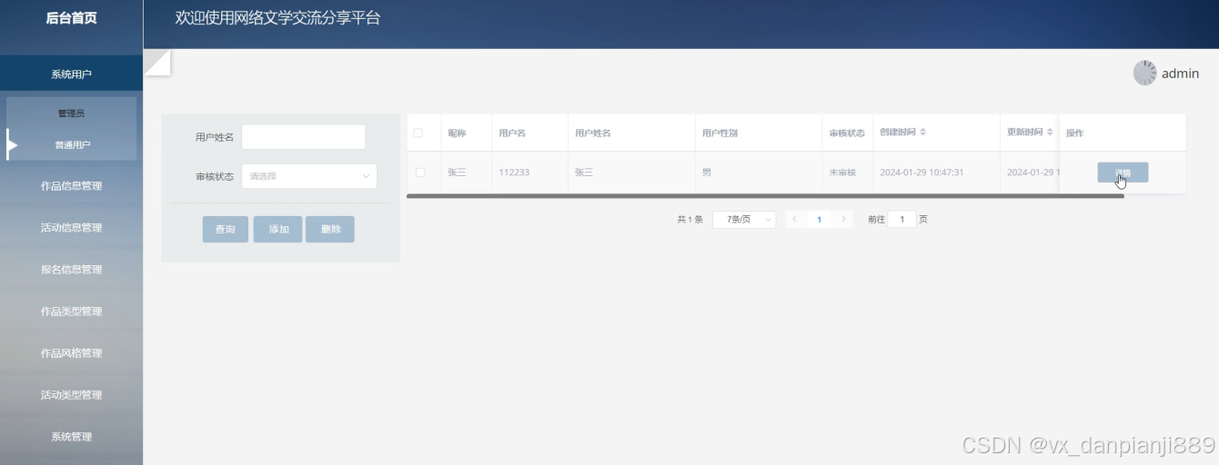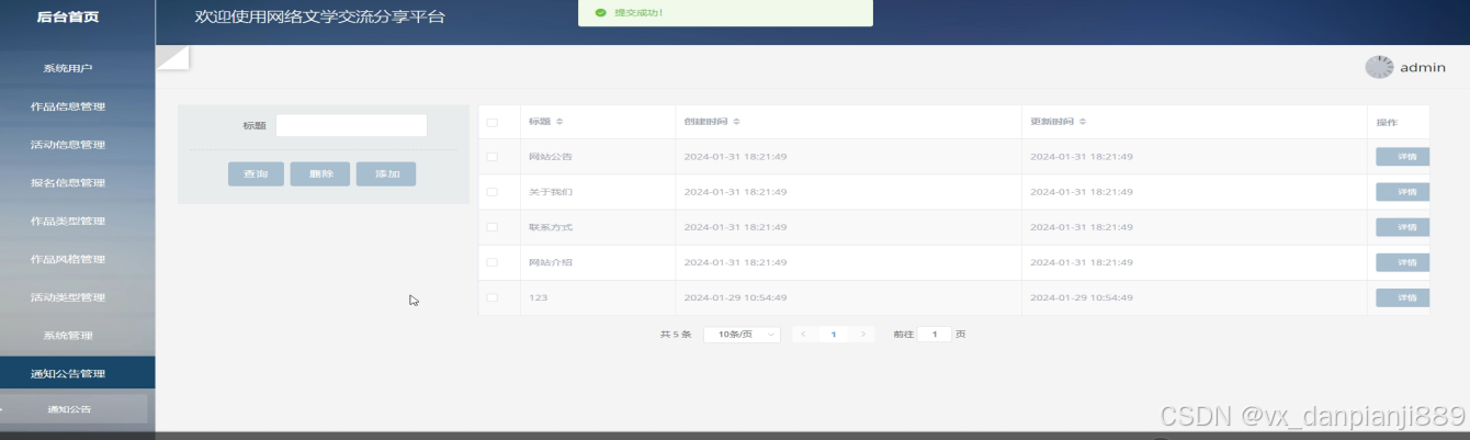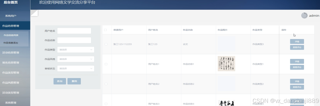(2)作品信息管理:管理员具有审核作品发布的权限,可以查看、编辑和删除作品信息,审核作品内容、作者信息等,对作品进行分类和标签管理,确保作品信息的准确性和规范性。