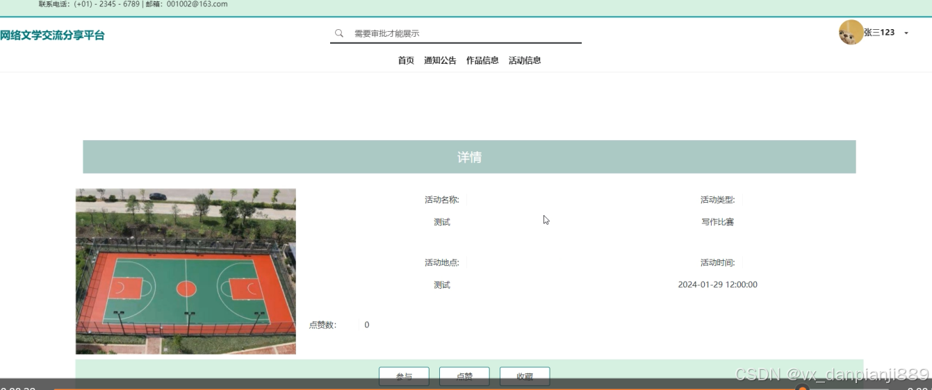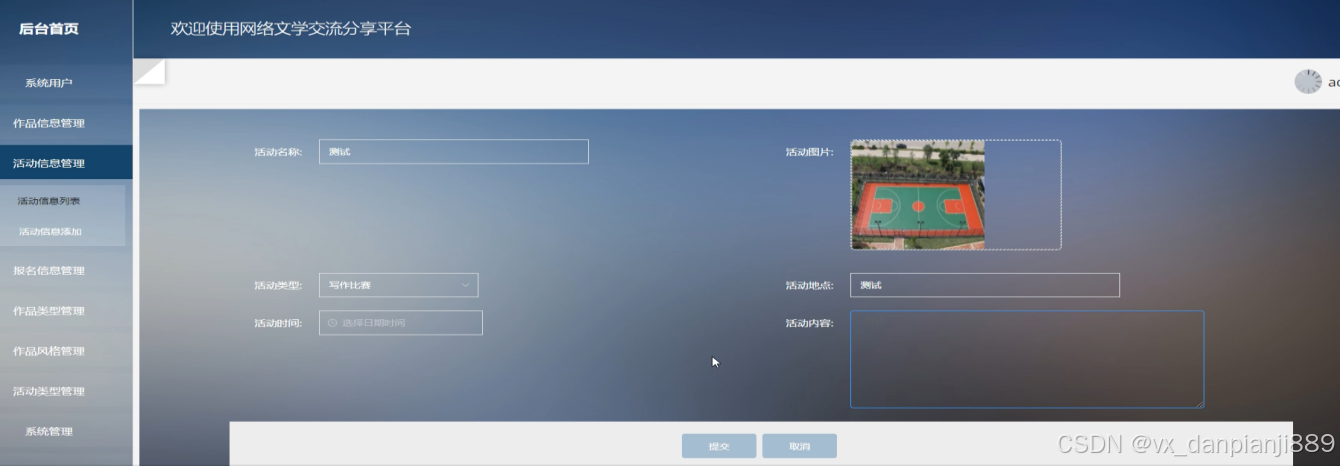 活动信息发布:管理员可以在系统中发布活动信息,包括活动名称、时间、地点、等详细内容。这些信息将显示在系统的活动页面上,供作者和读者查看和参与。如图4-5所示。