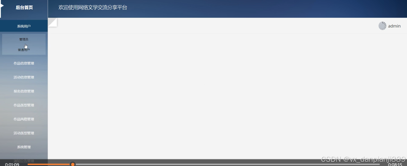 管理员登录进入网络文学交流分享平台可以查看系统用户、作品信息管理、活动信息管理、报名信息管理、作品类型管理、作品风格管理、活动类型管理、系统管理、公告管理等模块信息,如图4-7所示。