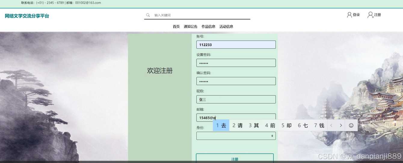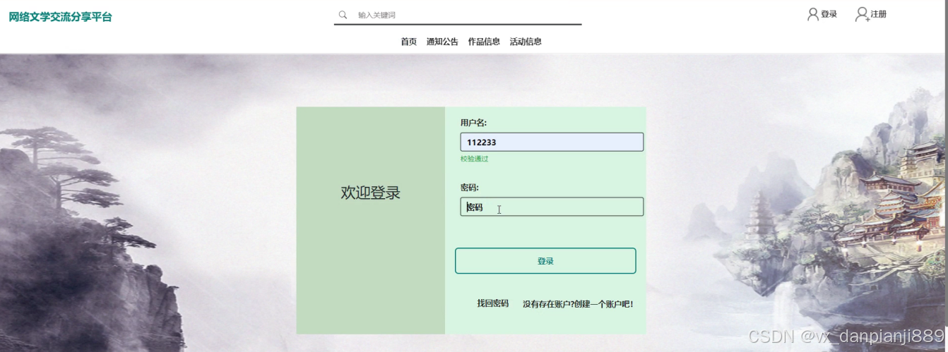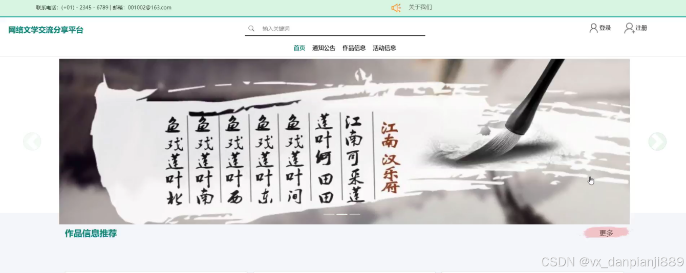 当用户进入网络文学交流分享平台的时候,首先映入眼帘的是系统的首页,首页展示的项目有通知公告、作品信息、活动信息等内容,如图4-3所示。