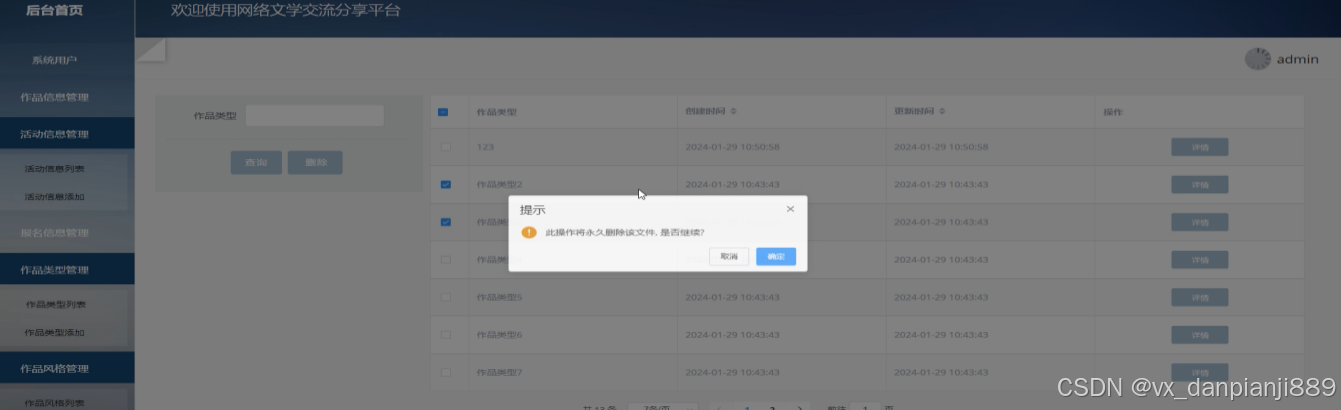 作品风格管理,管理员可以在作品风格管理中删除信息,删除作品风格会提示永久删除;如图4-11所示。