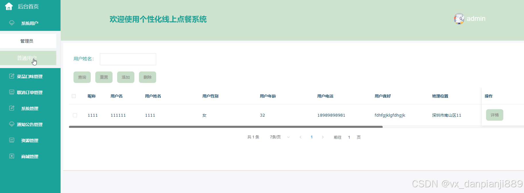系统用户,个性化线上点餐系统中的管理人员是可以对管理员和用户进行删除、添加等操作。系统用户界面如下图所示。