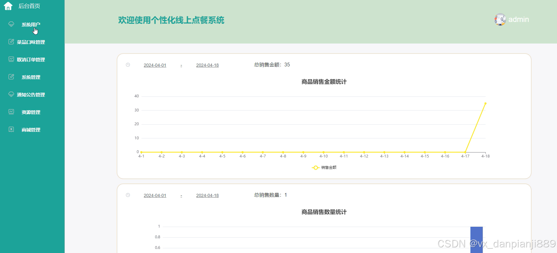 个性化线上点餐系统中的后台首页可以查看商品销售金额统计和商品销售数量统计。后台首页界面如下图所示。