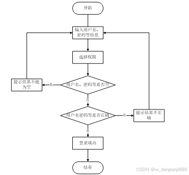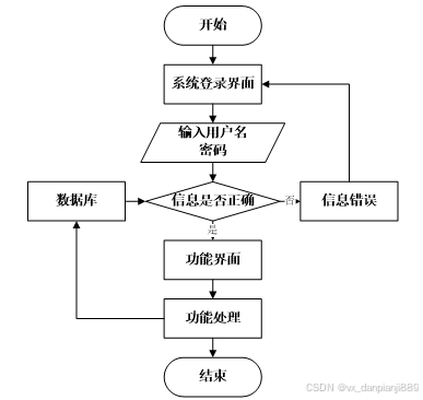 用户打开并进入系统后,会先显示登录界面,输入正确的用户名和密码,系统自动检测信息,若信息无误,则用户会进入系统功能界面,进行操作,否则会提示错误无法登录,操作流程如图3-3所示。