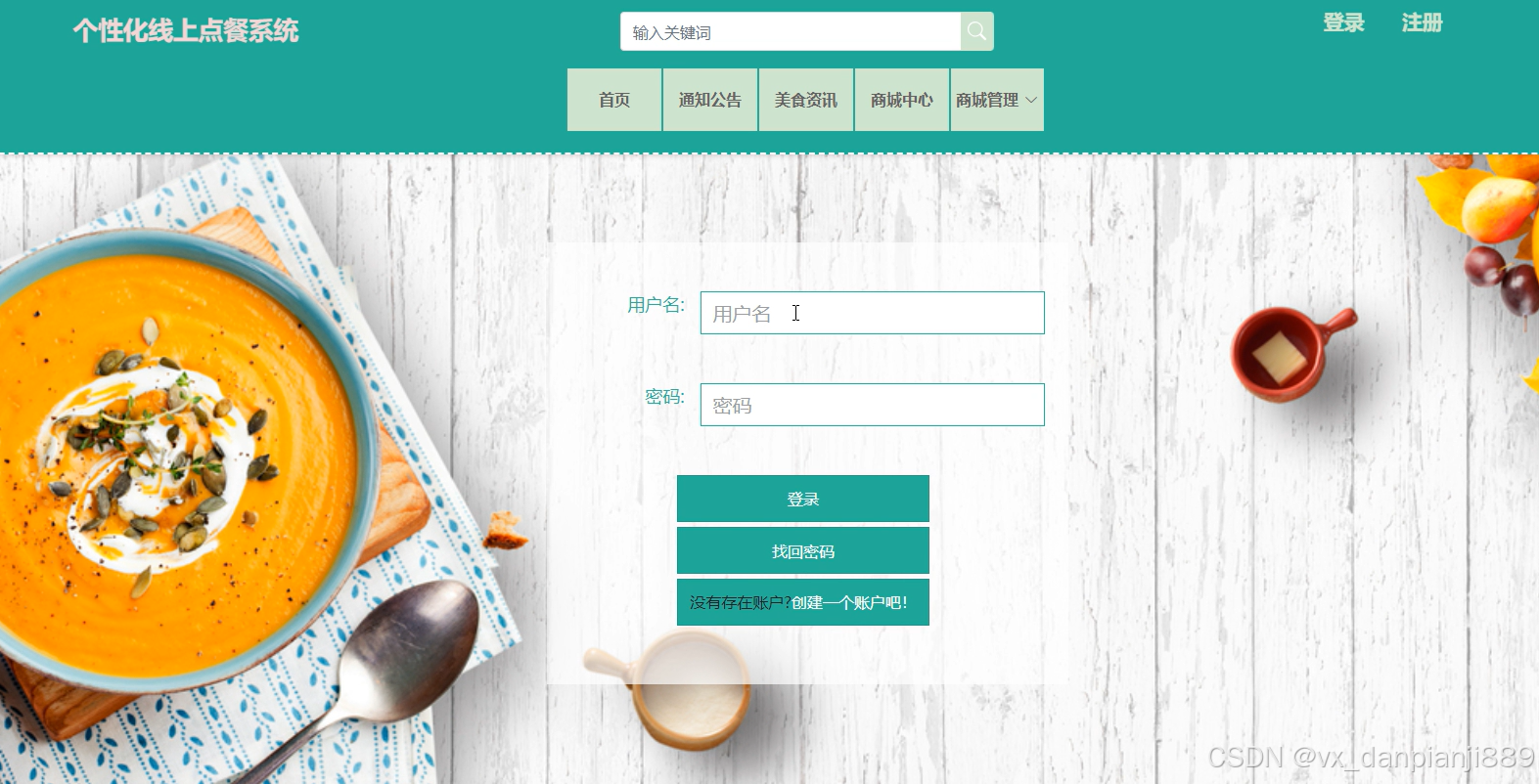 前台上注册后的用户是可以通过自己的用户名、密码进行登录的,当用户输入完整的自己的用户名和密码信息并点击“登录”按钮后,将会首先验证输入的有没有空数据,再次验证输入的用户名+密码和数据库中当前保存的用户信息是否一致,只有在一致后将会登录成功并自动跳转到个性化线上点餐系统的首页中;否则将会提示相应错误信息。登录界面如下图所示。
