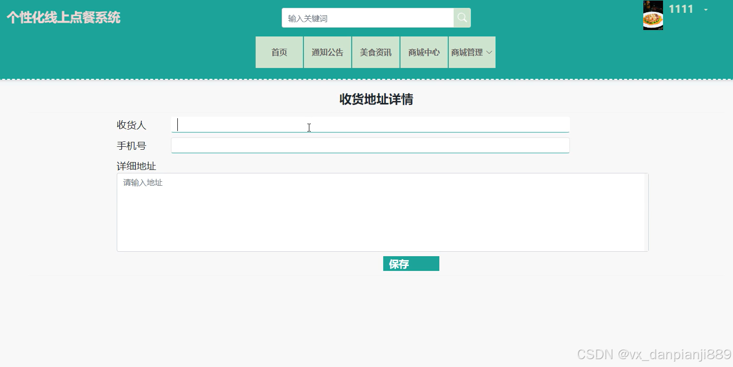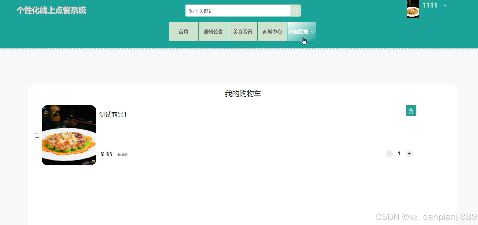 当用户点击个性化线上点餐系统中导航栏上的商城管理后可以查看我的购物车、我的订单、我的地址等信息,并进行相应的操作。