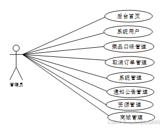 系统中的核心用户是系统管理员,管理员登录后,通过管理员菜单来管理后台系统。主要功能有:后台首页、系统用户、菜品口味管理、取消订单管理、系统管理、通知公告管理、资源管理、商城管理等功能。管理员用例如图3-7所示。