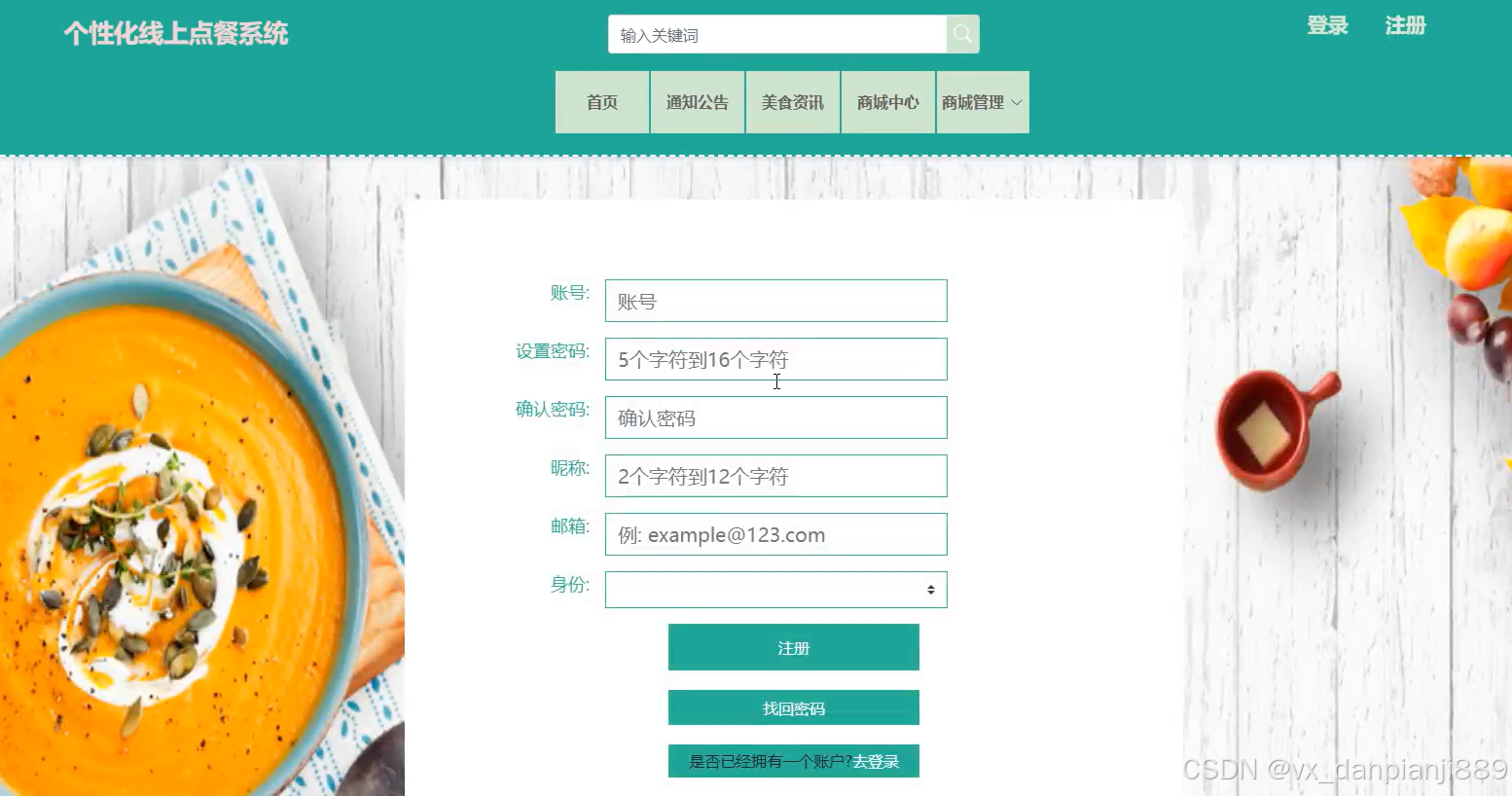 系统的用户通过自行注册生成,在系统首页点击用户注册菜单,系统跳转到对应的注册页面。点击重置按钮,清空所填数据,点击注册按钮完成注册。用户注册的时候添加菜品口味,为了方便系统在首页的商城中心给用户推荐相对应的菜品口味下面的菜品。用户注册界面如下图所示。