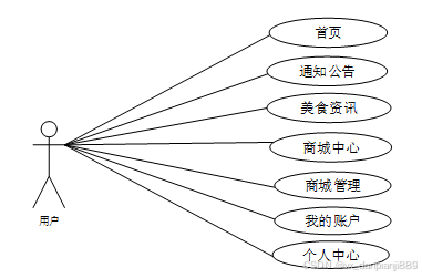 系统用户进入系统可以进行首页、通知公告、美食资讯、商城中心、商城管理、我的账户、个人中心等功能操作。系统用户用例如图3-8所示。